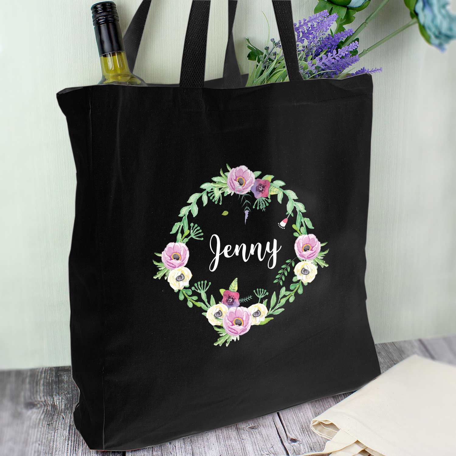Personalised Floral Black Cotton Bag