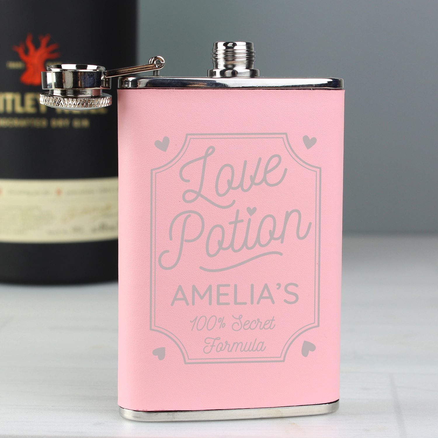 Fall head over heels in love with this Personalised Love Potion Pink Hip Flask!