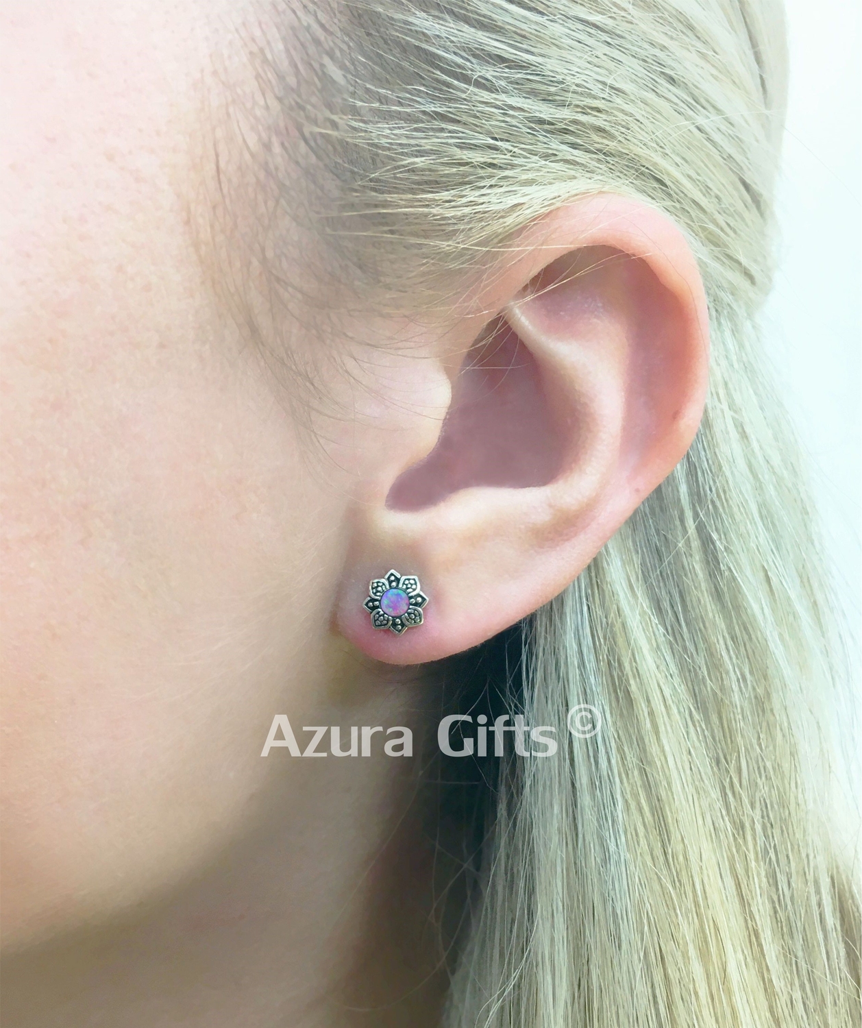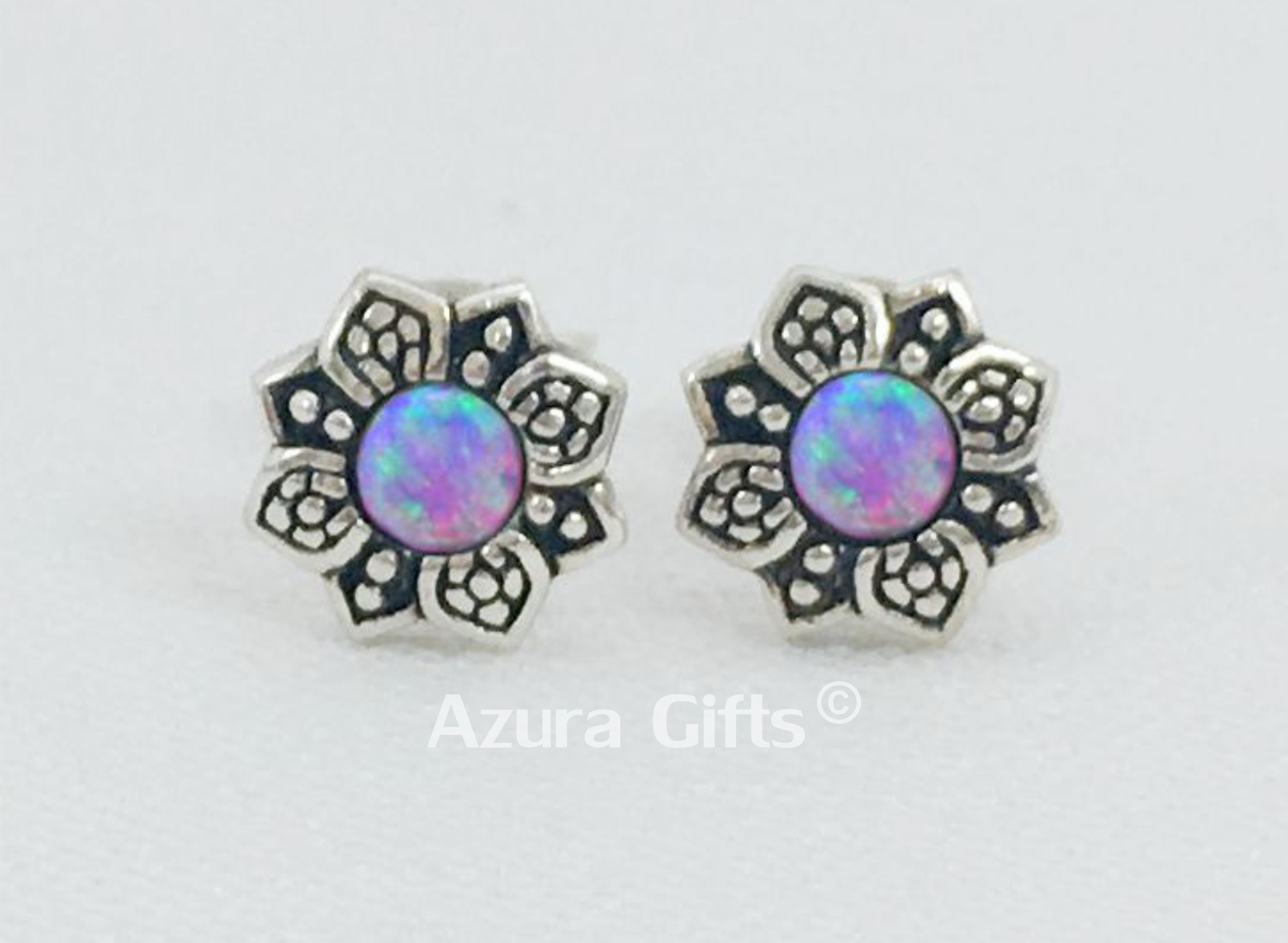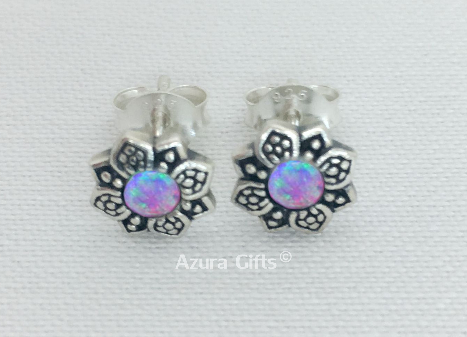 These beautiful flower studs are 925 sterling silver and part of the Azura Collection, they would make a perfect gift for someone who loves unique items. Each piece has a beautiful synthetic rainbow opal hand placed in the centre, this creates a flower effect.
